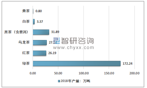2018年我国绿茶产量为172.24万吨,占同期国内茶叶总产量的65.84%;红茶产量为26.19万吨,占同期国内茶叶总产量的10.01%;乌龙茶产量为27.12万吨,占比为10.37%;黑茶(含普洱)产量为31.89万吨,占比为12.19%。