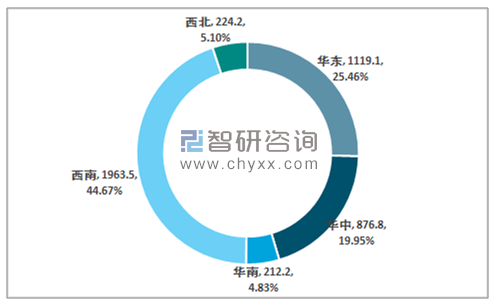 2018年我国华东地区茶园面积为1119.1万亩,占国内茶园总量的25.46%;华中地区茶园面积为876.8万亩,占国内茶园总量的19.95%;华南地区茶园面积为212.2万亩,占国内茶园总量的4.83%;西南地区茶园面积为1963.5万亩,占国内茶园总量的44.67%;西北地区茶园面积为224.2万亩,占国内茶园总量的5.10%。