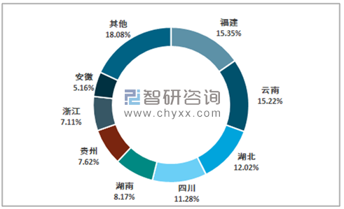 智研咨询发布的《2019-2025年中国茶叶行业市场运行态势及投资战略咨询报告》显示:2017年我国茶叶产量为246.04万吨,2018年我国茶叶产量增长至261.60万吨。我国茶叶产量超过20万吨的省市有福建、云南、湖北、四川、湖南五大地区,其中福建省茶叶产量为40.16万吨,占同期国内茶叶总产量的15.35%;云南省茶叶产量为39.81万吨,产量占比为15.22%;湖北省茶叶产量为31.45万吨,产量占比为12.02%;四川省茶叶产量为29.50万吨,产量占比为11.28%。