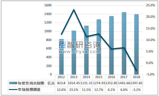 2012-2018年中国包装饮用水行业市场规模及其增速
