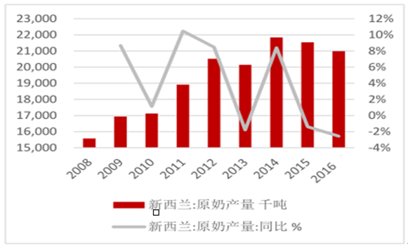 预计2017年全国原奶产量依然延续负增长,但相对于新西兰等传统乳制品生产国,降幅将更加平稳,因此国内的生鲜乳价格上涨幅度也将有限。