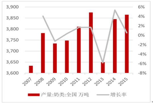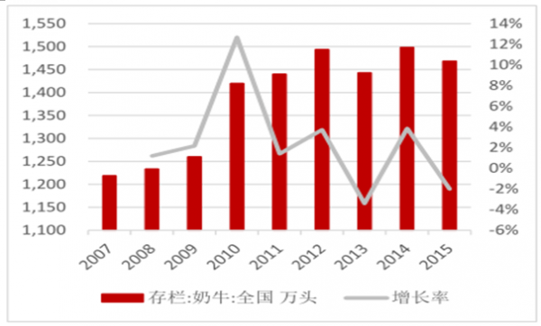 2011至2015年,我国进口奶牛共69.46万头,新增原奶产能600余万吨,增长幅度超过15%。“三聚氰胺”事件后所导致的奶荒促使上游乳企大幅新建与扩建规模化牧场,导致2014年全国奶牛存栏量继2010年后再次明显上涨,供给大幅度增加,因此,2014年下半年乳制品产能又开始出现严重过剩。进入2015年,上游乳企开始主动淘汰低产乳牛,引进效率更高的品种,供给收缩明显,2015、2016年国内奶牛存栏量负增长。