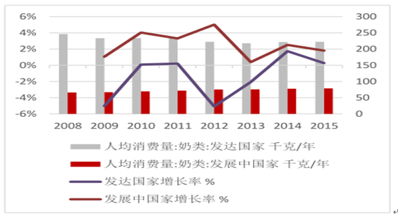 人均消费量方面,虽然发达国家和发展中国家具有较大的差距,且发展中国家的增长率显著超过发达国家,但2015年受世界经济低迷的拖累,全球乳制品消费量增速都在降低,发展中国家2015年增速也并未超越2%,与之前分析的结果相符。
