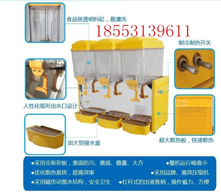 滨州三缸喷淋式冷热饮果汁机的采购批发果汁机新款:果汁机、冷热饮机、果汁冷饮机、休闲冷饮果汁机。首先说一下这款三缸喷淋式冷热饮果汁机的技术参数,型号:LRPC18*3 容量:18L*3 净重:48KG 电源:220V/50Hz 尺寸:725*386*728 价格:2600元品牌: 东贝 备注:冷热 三缸。