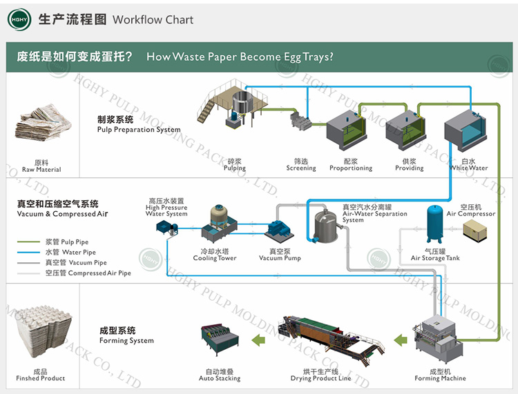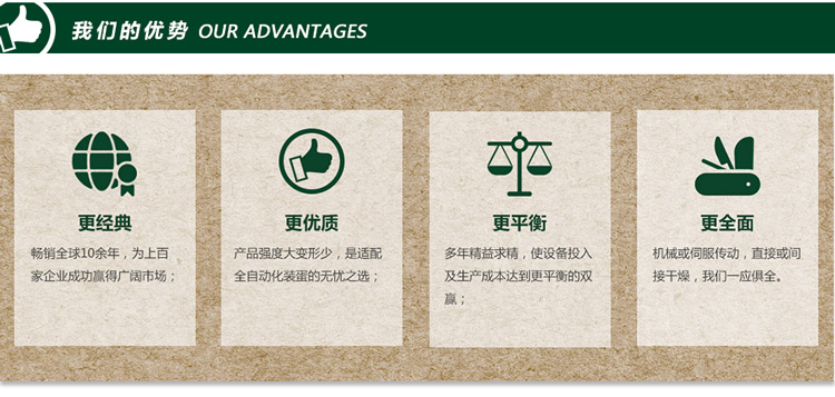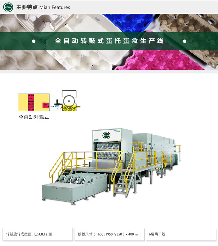 全自动转鼓式蛋托蛋盒生产线主要适用于生产鸡蛋托盘、鸡蛋包装盒、水果托盘、饮料杯托、瓶托等形状较规则的低矮产品。以全自动转鼓式蛋托蛋盒生产线为主要系统的纸浆模塑生产线,具有以下特点: