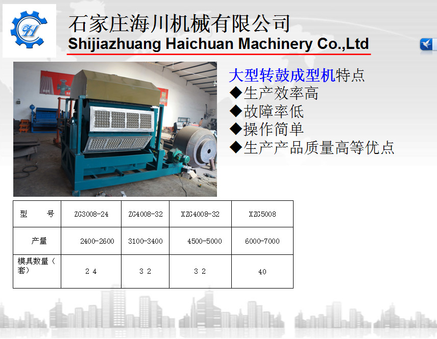 **:既然是蛋托机厂家,那么企业本身**要拥有一条**的蛋托生产线,只有经过不断的实验,不断的改进设备才能更加的稳定和**,在所有的蛋托机厂家当中,海川机械是**一家集生产线与设备研发为一体的蛋托机厂家。