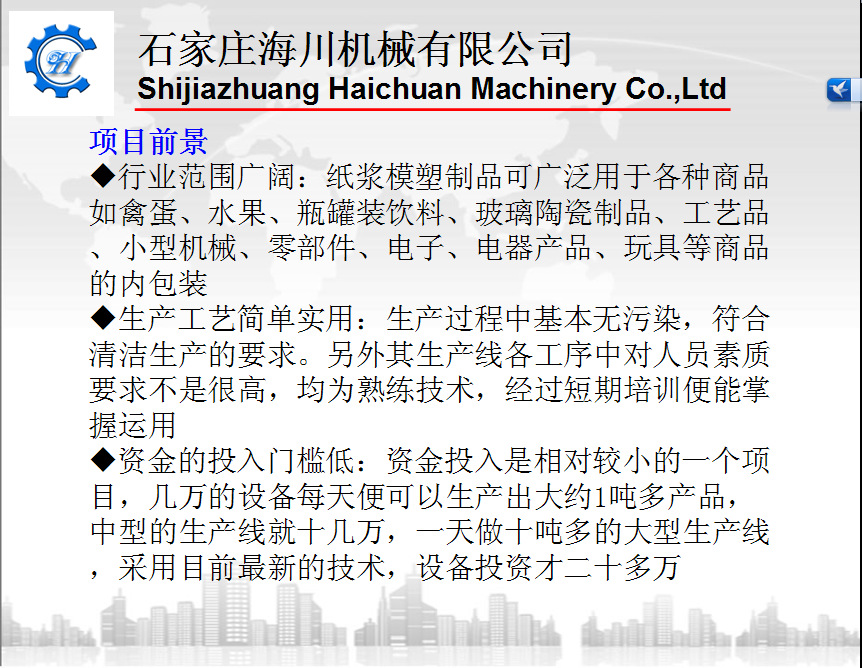 石家庄海川机械一直专心致力于研究蛋托机械,蛋托设备,秧苗盘设备,瓶托机设备,**好的纸浆模塑设备的生产。产品畅销全国30多个省、市、自治区,并远销欧洲、中亚和东南亚等地,深得客户信赖,受到业界的一致好评。 哪里卖瓶托设备,蛋托设备,秧苗盘设备设 **好的蛋托设备 蛋托机械厂家 选择石家庄海川蛋托机械厂的纸浆模塑设备,决定让你物超所值,用**低的价格,购买**好的设备。蛋托设备主要有:纸浆模塑设备、纸浆蛋托设备、鸡蛋托盘机、纸浆蛋托设备、瓶托机设备,秧苗盘设备,全自动旋转式,蛋托机械、蛋托设备等等。产品种类繁多,您尽可放一百个心选购适合自己的机型。