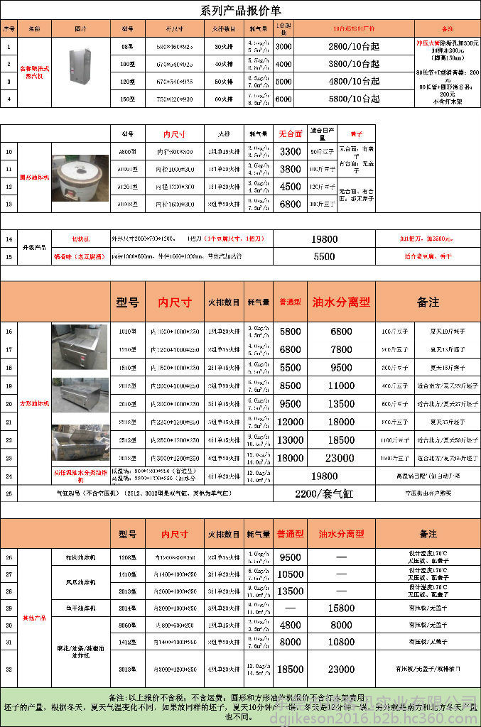 | 型号 | 内尺寸 | 火排 | 耗气量 | 无台面 | 适合日产量 | 盖子 | ||||||||||||||||||||||||||
