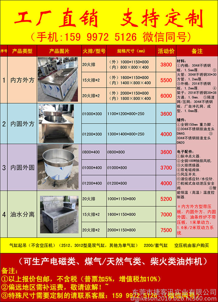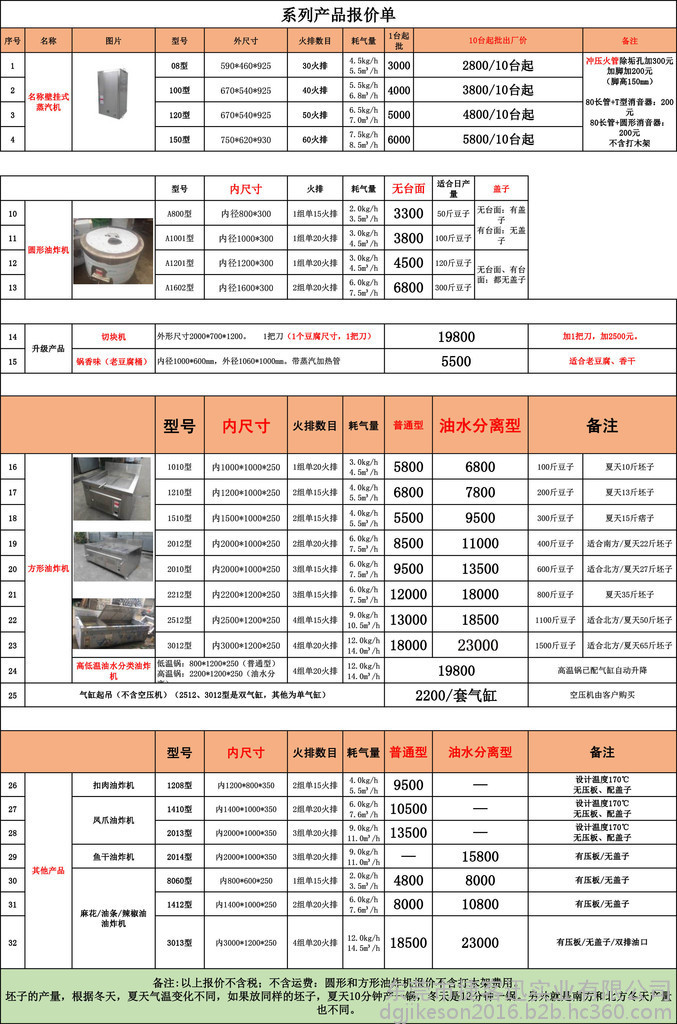 | 备注:以上报价不含税;不含运费:圆形和方形油炸机报价不含打木架费用。 坯子的产量,根据冬天,夏天气温变化不同,如果放同样的坯子,夏天10分钟产一锅,冬天是12分钟一锅。另外就是南方和北方冬天产量也不同。 | ||||||||||||||||||||||||||||||||