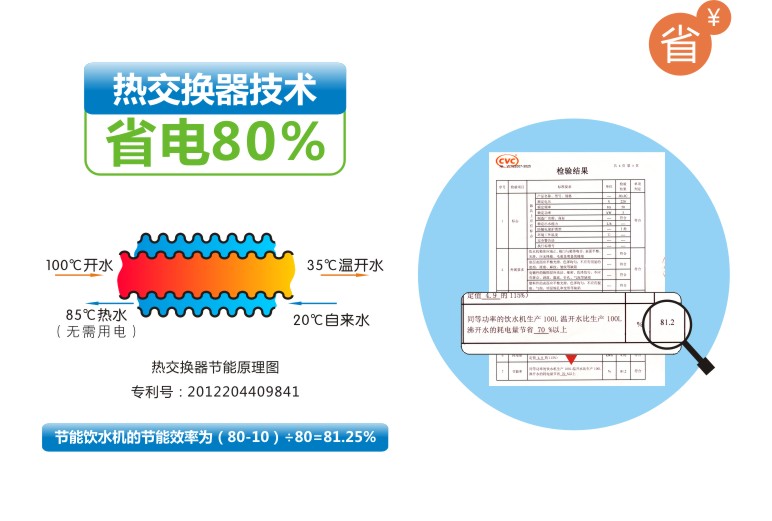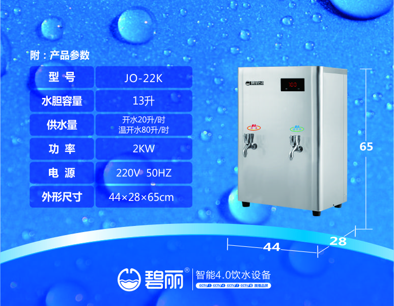 **形式:一开一温 可供50人饮用。如全部饮用温开水,可供人数增加60% 全部饮用开水,可供人数减少30%上述所标饮水人数为陆续饮水人数,而非同时饮水人数。 产品特点: ■ 特设高效热能交换器,省电80%; ■ 具有智能水控系统,水不开,则无水流出,避免饮用生水; ■ 全不锈钢制造,水槽模压成型,人机工程设计; ■ 常压式技术设计,更安全。 注:适用水压0.05-0.6MPa,适用水源,城市自来水。 节能饮水机能带来的效益: 1、经济效益 据测,200人每天喝400升温开水,用碧丽节能饮水机只需要7.2度电,而使用普通开水器需用38度电,因此,碧丽节能饮水机比普通开水器每天节约30.8度电,每月节约924度电,每年节约11088度,按每度1元,每年可省1.1万元。 喝温开水比喝开水每人每天可节约20分钟,200人可节约4000分钟,折合66.7小时,相当于8个人的工作量,按每人800元计算工资,每年可减少工资支出7.7万元。 若饮用桶装水,200人每天需要10桶水,按每桶5元,每年桶装水费需要1.8万元。 2、员工满意度 员工天冷的时候喝温开水、开水更方便; 员工饮水更健康; 员工冬天泡茶、泡面也能很好解决; 员工中间休息喝水较少排队。 3、饮水健康 由于保留了水中对人体有益的空物质、所以比桶装纯净水更健康。 4、工作效率 免去了不断更换桶装水的麻烦 ; 无需专人去搬运、监管桶装水 ; 水**较多、供水量大,减少等待时间; 温开水(水烧开后降温)可直接饮用,比喝开水省时间。 |