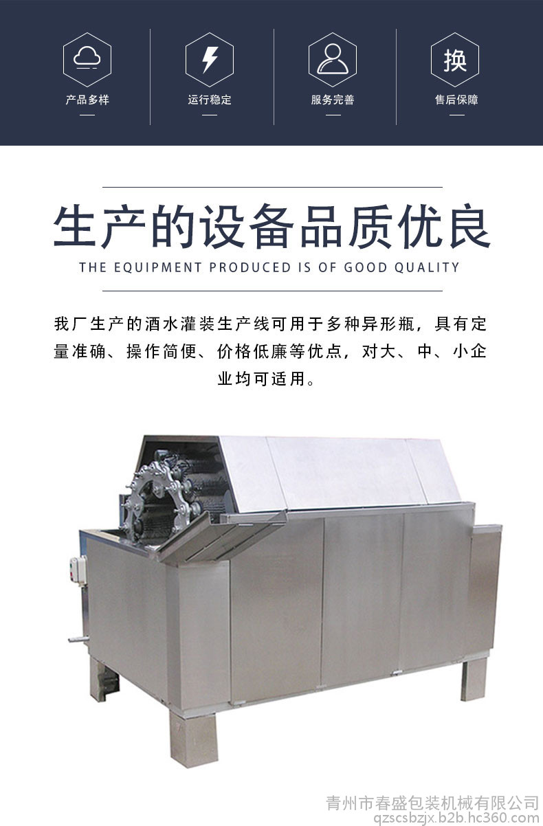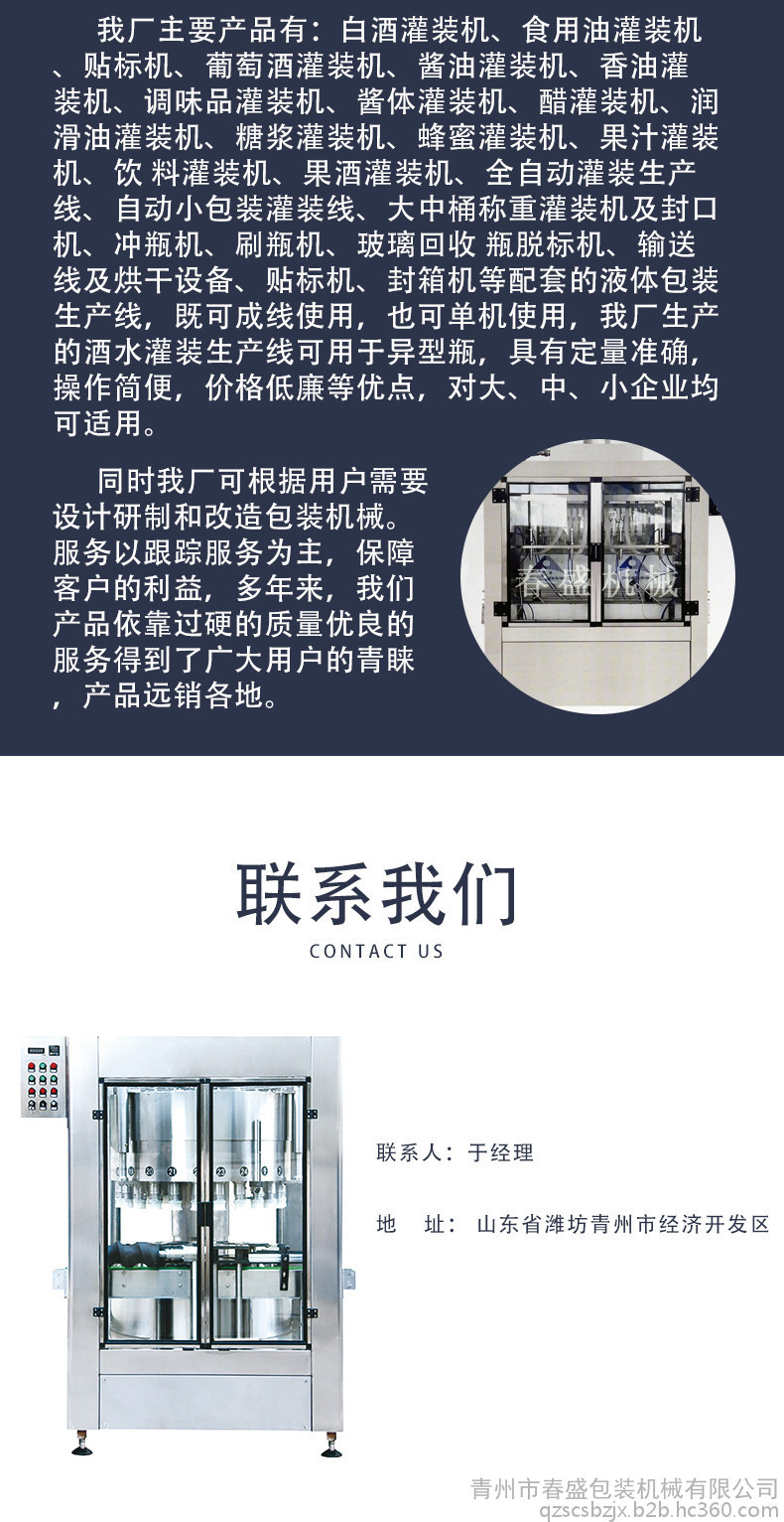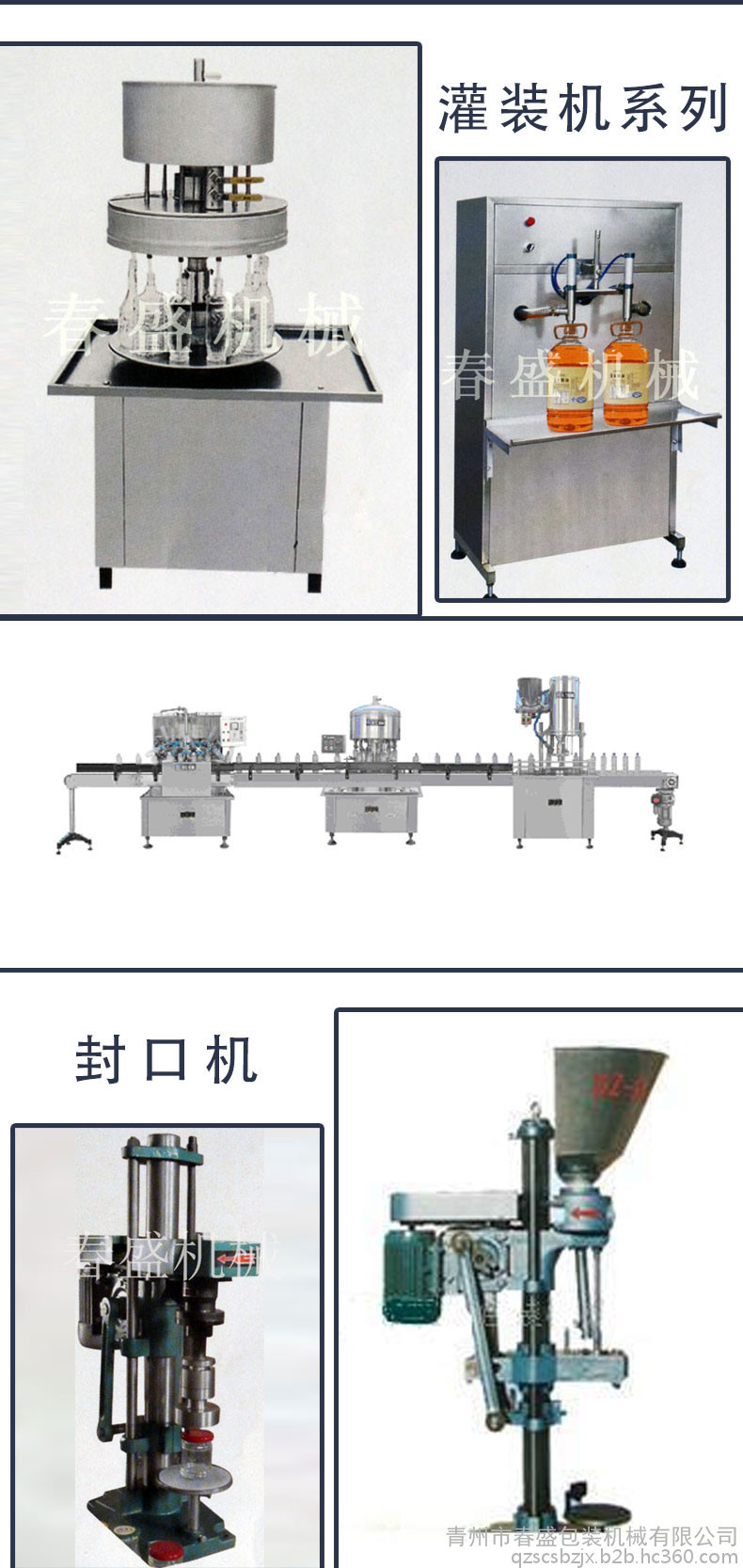 青州市春盛包装机械有限公司是一家集开发、生产销售为一体的综合性包装机械制造企业。为酒水、饮料、酿造等行业生产灌装流水线,产品包括冲瓶、灌装、 封盖、烘干、输送、贴标等系列设备。公司自建立以来,坚持高质量、高服务的立业方针,以标准高、严要求的质量控制体系,周到的售后服务有了大量的优良业绩,深受广大用户好评。公司服务宗旨、理念及目标:以诚信的产品质量为宗旨;以真诚、人性化的服务为理念;以让每个客户都满意为目标。欢迎新老客户光临咨询。