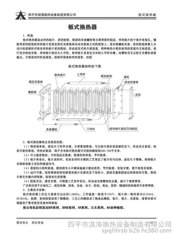 板式换热器板片材质为304不锈钢,316L不锈钢,钛板。使用压力不超过2.0MPa。板式换热器的使用温度不超过150℃,当热介质为蒸汽时,可选购高温板式换热器。