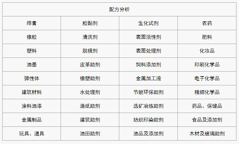 配方分析可以帮助我们快速,准确地获得样品的基本配方,应用于新产品研发方面,配方分析可能大幅度的缩短研发周期,降低技术成本,也可以分析产品配方,用于指导配方分析,了解同行的配方。