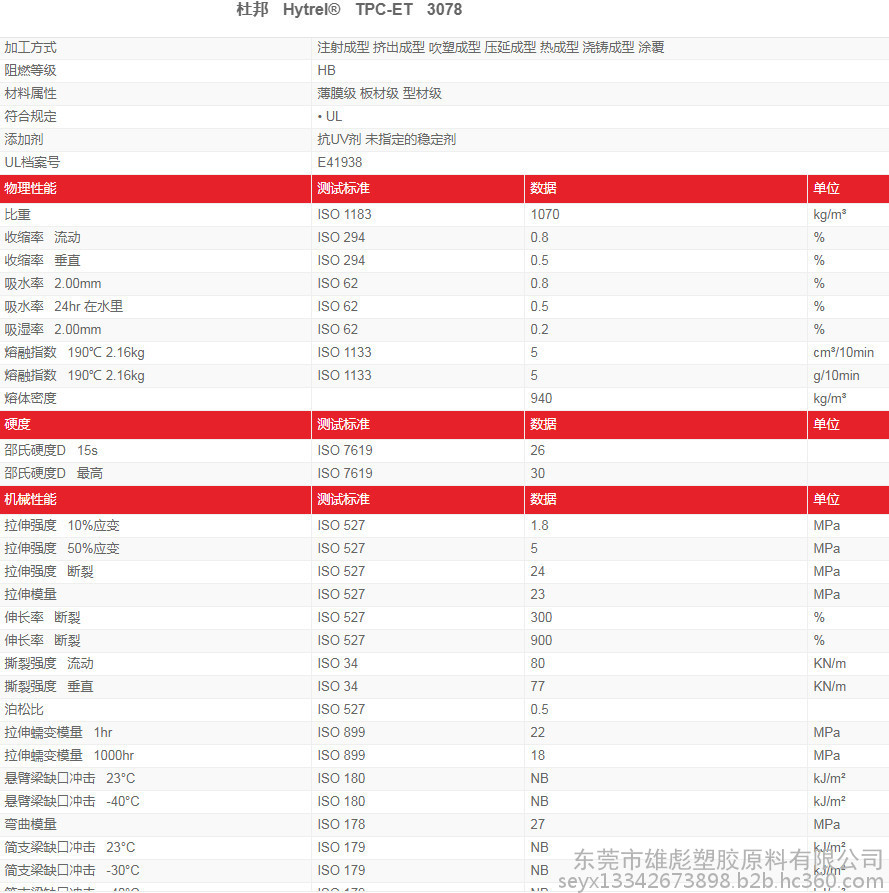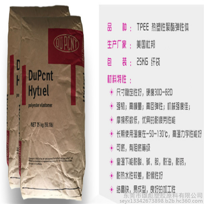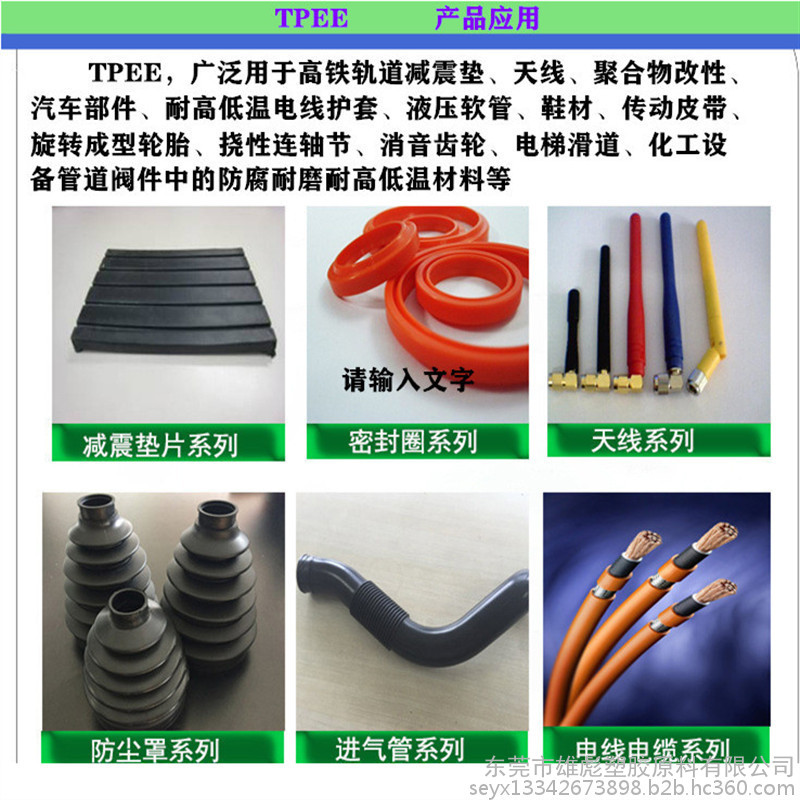 TPEE 美国杜邦 3078 邵氏硬度26-30 汽车部件、带类、软硬管道;电缆套塑、织物涂覆,传动带、软管、电缆接头; 齿轮、轴承、线包线。电子电器。消防水龙带、软硬复合制品; 密封剂、各种齿轮类、天线、压缩簧、管覆层 运动用品日用消费品; 软管套,以及液压软管带、管道、密封材料;体育用品的薄膜及部件等.....