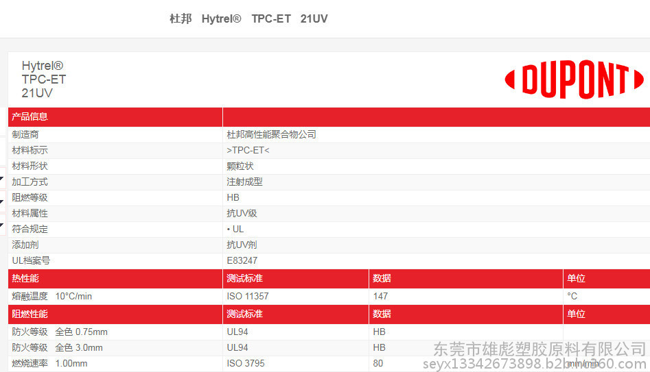 TPEE 美国杜邦 21UV 耐紫外光性能好 汽车部件、带类、软硬管道;电缆套塑、织物涂覆,传动带、软管、电缆接头; 齿轮、轴承、.....