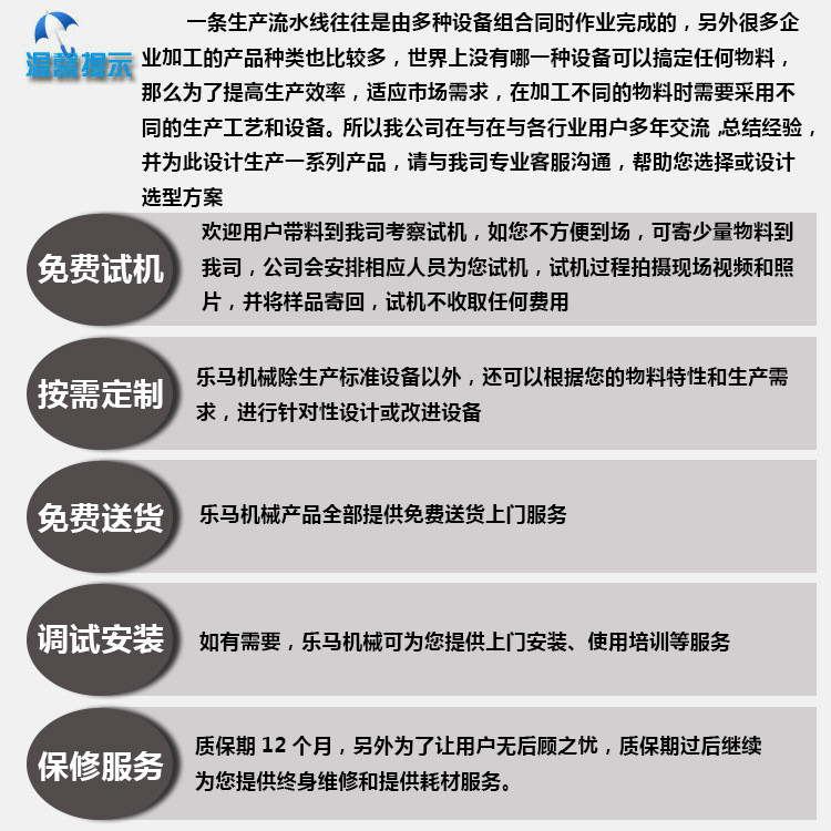 通过多年来和客户接触发现非常多用户都有买错设备的经历,对于这个现象我司非常重视。所以特意建造了实验室,强烈建议每个用户在购买设备前寄料或带料来我司进行试机测试,我们会根据物料特点和制粒要求选择制粒机并进行试机测试,对应一些不便带料到我司现场试机的用户,我们会在试机过程时录制视频或者通过视频通话方式观看试机过程,并将制作好的颗粒免费寄回给客户进行测试。