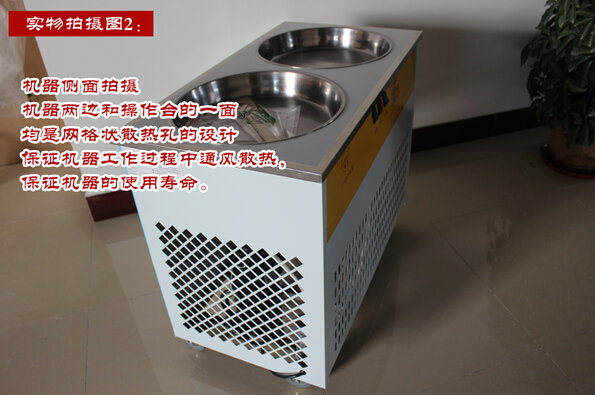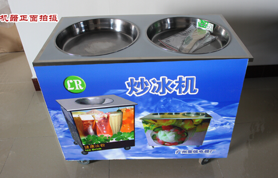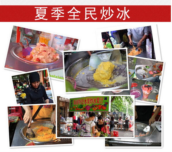6.因炒冰机采用大功率压缩机,制冷速度快。所以在制作炒冰时饮料会因过冻而贴紧锅底,利用炒制,此时应打开除霜开/关2-5秒钟直到容易铲炒时再关掉开关。