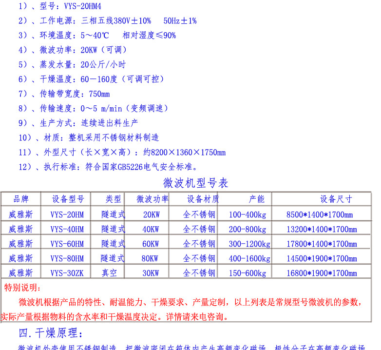 微波烘干设备采用的是不锈钢材质,做工精细,坚固耐用,造型美观,有很好的抗腐蚀性。设备是由多节干燥箱体串联组合,再加上传输带,形成隧道流水线式设备。设备装有进料器,物料通过设备的进料器平铺到传输带上,传输带再把物料运送到干燥箱内进行烘干干燥,完成烘干干燥作业。在整个干燥的过程中,传输带是没有停止的,物料在传送的同时**能到达烘干的效果,所以设备具有连续式大量生产的能力。设备干燥时的温度一般在80~150度之间,设备实际的烘干温度是可以调节,能根据需求随意调节,能达到更好的干燥效果。