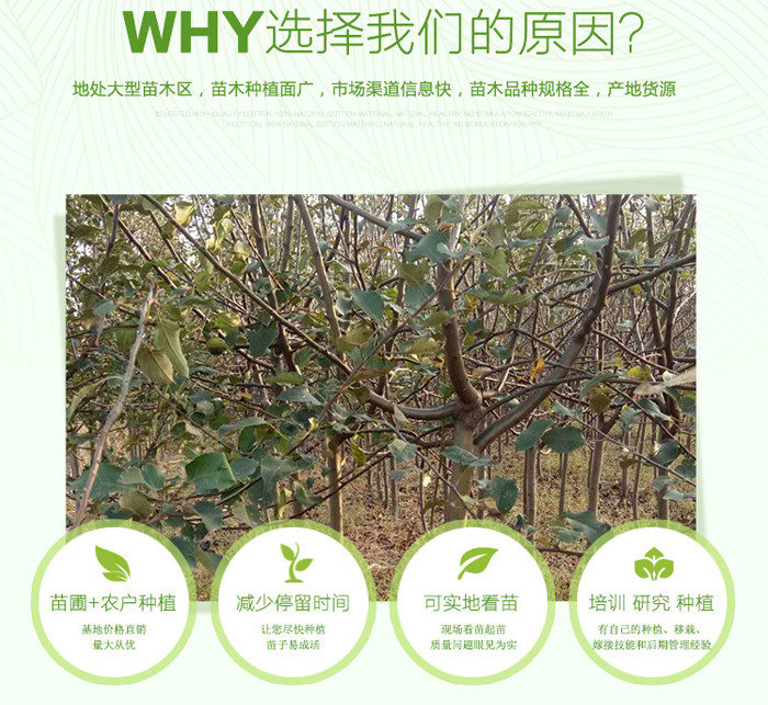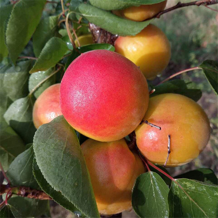 | 杏树苗: 杏其果又称杏子、杏实,是杏属李亚属植物,其果肉、果仁均可食用。杏的学名指出:西方人对杏的认识,乃源于亚美尼亚。事实上,杏广布于东亚及中亚。为乔木,高5-8(12)米;树冠圆形、扁圆形或长圆形;树皮灰褐色,纵裂;多年生枝浅褐色,皮孔大而横生,一年生枝浅红褐色,有光泽,无毛,具多数小皮孔。亚热带、温带植物。果实成熟后呈金黄色称杏子,是一种水果植物,普遍栽培于世界温带地区。果肉豔黄或橙黄色,鲜果可生食,也可制成果酱、罐头、杏乾等。治疗大肠干,便秘等病,还可以治疗消化不良的症状。有的品种核仁甜,有的则有毒。[1-2]杏的介绍杏是我们熟知的一种食物,学名是Prunus armeniaca,又称杏子,是李属李亚属植物,其果肉、果仁均可食用。它原产中国**种和栽培品种资源都非常丰富。全世界杏属植物划分为6个地理生态群和24个区域性亚群,共有10个种。其中中国**有9个种:普通杏、西伯利亚杏、辽杏、紫杏、志丹杏、政和杏、李梅杏、藏杏、梅。栽培品种近3000个,普通杏种分布广。 |