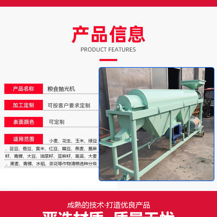 该设备用于玉米、绿豆、黄豆等各种豆类的清杂、去灰、除尘、擦亮抛光之用,可一次性豆类的泥花脸。广泛适用于食品厂、豆制品厂、农贸市场豆类销售处。通过抛光的豆类明显了豆类品质,可实行优价。