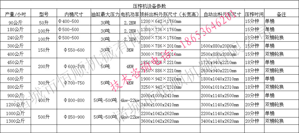 若采用双桶互换的装卸和压榨物料,使生产量提高一倍以上。该设备操作简便,坚固耐用,维修方便,压榨力大,生产效率高。