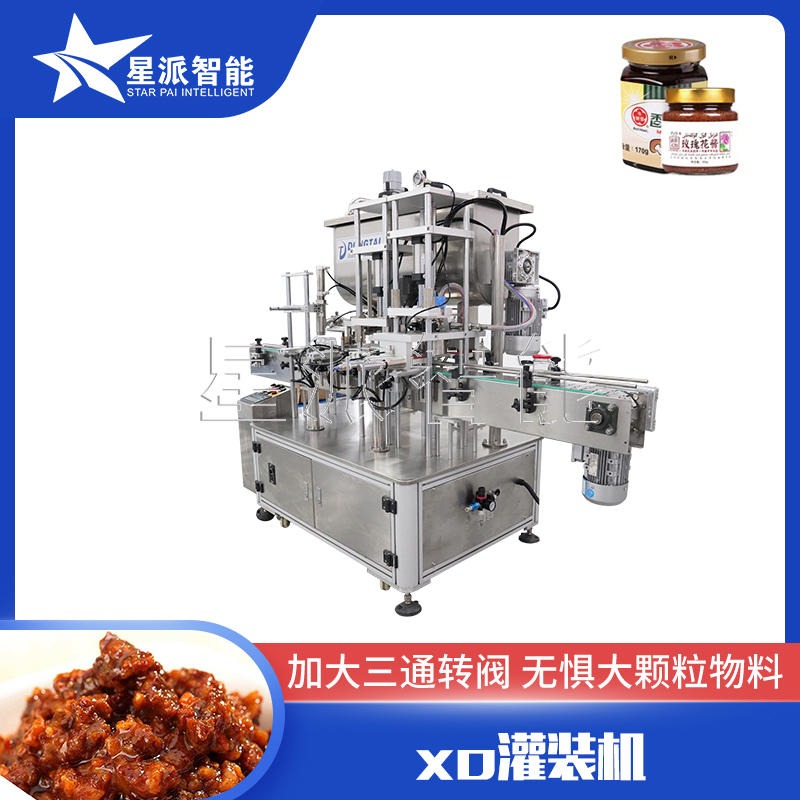 本机主要对食品行业的酱类分装设计生产,尤其是适用于调味品中带颗粒并且浓度较大的辣椒酱、豆瓣酱、花生酱、芝麻酱、果酱、牛油火锅底料、红油火锅底料等物质的粘稠酱类的灌装。