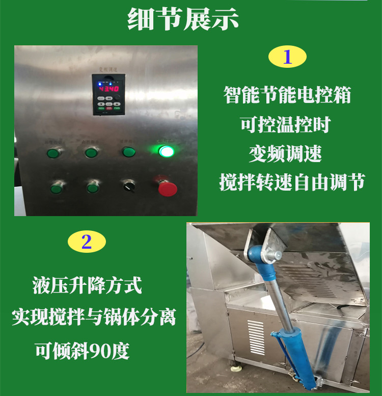 1、本产品为可倾式下搅拌炒锅,解决了上搅拌的出料难、不易清洗的问题.