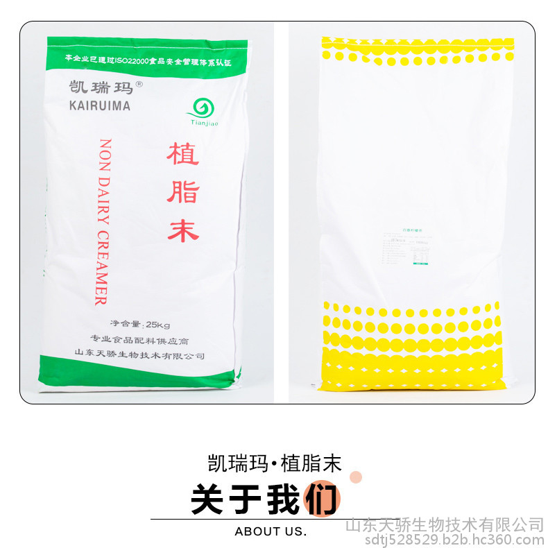 我公司山东天骄生物技术有限公司是专业致力于食品配料的科研.开发.生产和销售为一体的科技型企业。企业始建于2004年,我公司主要生产植脂末、粉末油脂、植物脂肪粉、代乳粉、奶片专用植脂末、烘焙专用植脂末、咖啡专用植脂末、奶茶专用植脂末、烤奶专用植脂末、固体饮料、麦芽糊精、麦芽糖粉和低聚异麦芽糖粉、三合一咖啡、三合一奶茶等等。本公司产品销往全国各地并出口国外50多个。