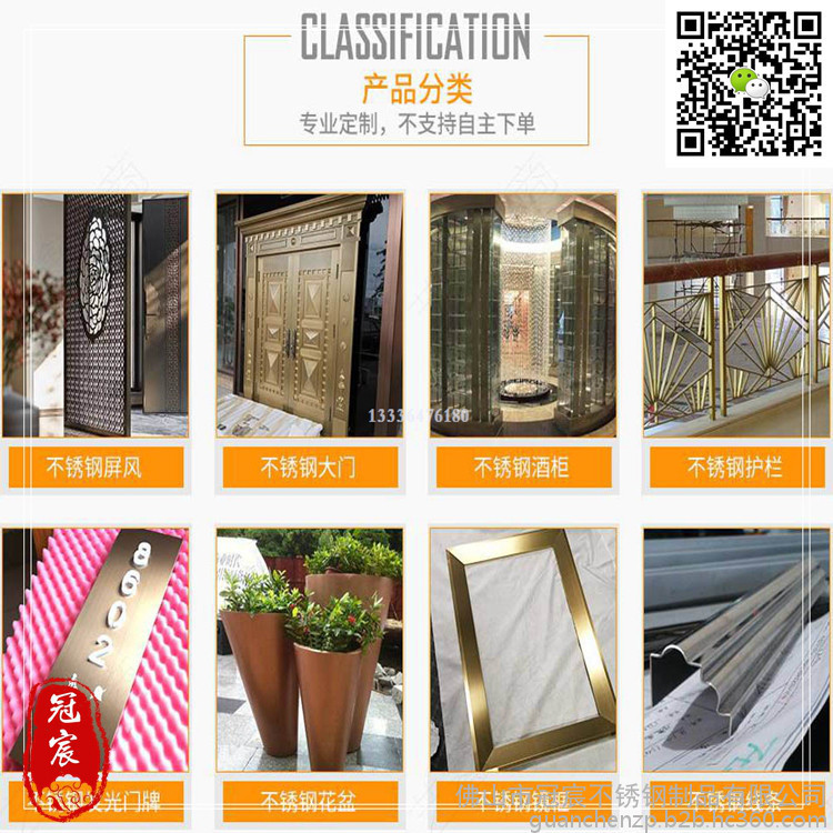 ?佛山市冠宸不锈钢制品有限公司位于中国佛山,是一家专业从事研发、生产钛金系列产品、 彩色不锈钢、艺术不锈钢产品的企业。产品有彩色不锈钢、不锈钢钛金板、不锈钢装饰板、不锈钢镜面板、不锈钢喷砂板、不锈钢蚀刻板等,加工工艺有镀钛加工、不锈钢镜面加工、不锈钢喷砂加工、玻璃喷砂加工、不锈钢蚀刻加工。我们的理念 : 创立世界品牌为目标,以客户满意为宗旨。佛山市冠宸不锈钢有限公司是一家拥有十年彩色不锈钢板、不锈钢蚀刻板、不锈钢钛金板、不锈钢装饰板表面处理经验的公司,现有高精度8K镜面、水镀黑钛、真空镀钛、蚀刻、压纹、彩色覆膜、镀铜等先进工艺.