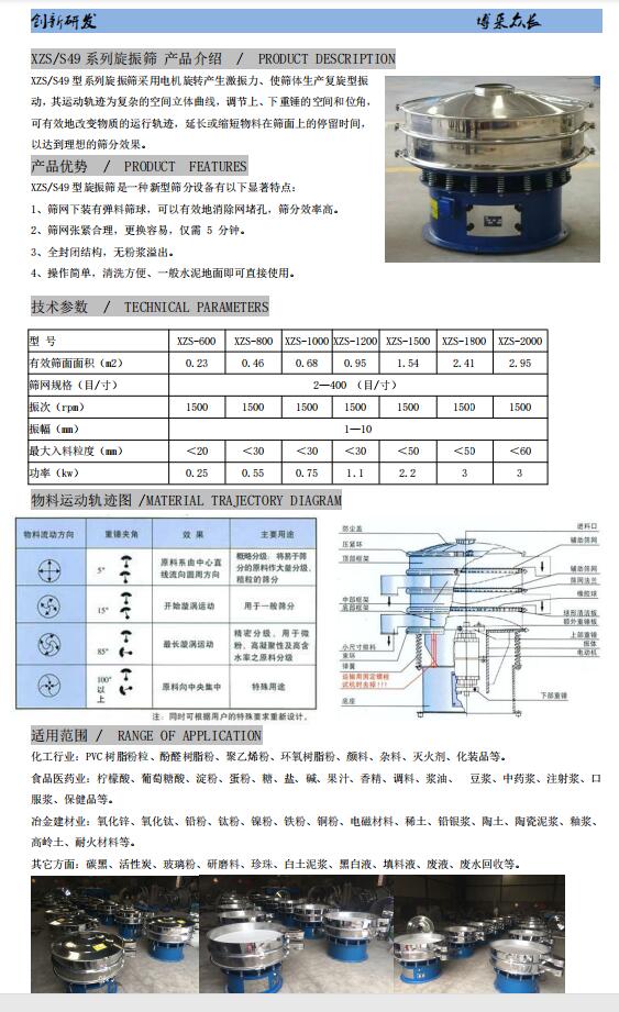 与其它惯性筛分设备相比,旋振筛具有以下显著特点: 1、筛分效率高。旋振筛筛分精度一般在90%以上。 2、结构,而且密封效果好,基本不存在物料粉尘污染现象。 3、相对体积小、重量轻、安装简单、维修方便。 4、出料口可在360°圆周内任意调定,便于工艺布置。 5、筛网更换方便,可一般物料的干、湿式分级要求。 6、筛面可方便地加设清网装置,可有效解决筛面堵塞问题。 7、通过加设超声转换仪,能有效解决超细物料难筛分的问题。 8、通过调节电机上下偏心块的相位,可改变物料在筛面上的运动轨迹,适合对难筛物料筛分作业。