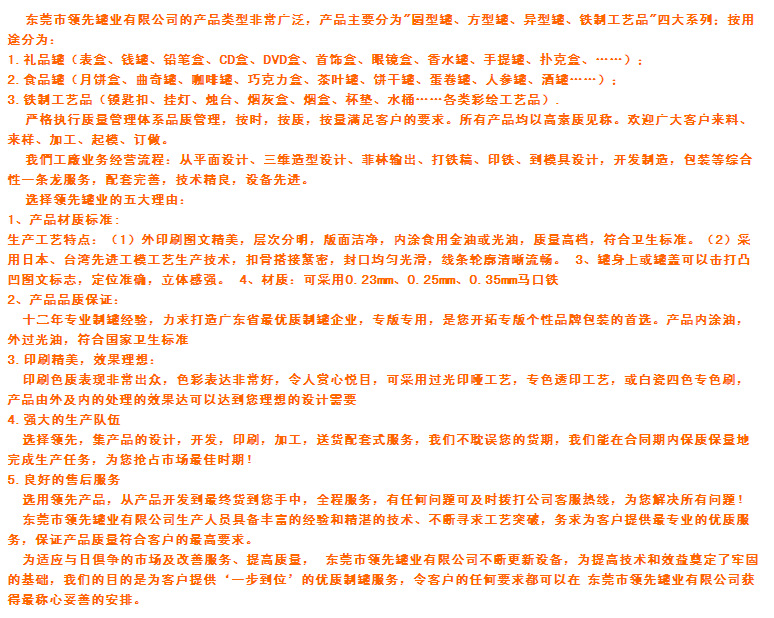 我们是专业生产铁盒,铁罐等包装产品的工厂,以合理的价格**的产品,真诚的服务,期待与您合作。谢谢