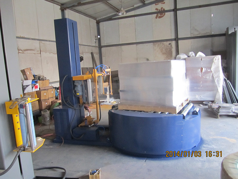 缠绕机械工作原理是将被缠绕物体放置于转盘中央,启动转盘电机转动,自然地带动转盘转动,使物体实现了外围的缠绕膜机。与此同时升降机电机也启动,带动缠绕捆扎机整个组合体做上下运动,达到物体高度方向的缠绕,这**实现了物体整个外表的缠绕包装。这样不仅有利于货物储存、运输及机械化装卸作业的包装要求,又能防止货物在搬运过程的损坏,起到防尘,防潮及保洁作用,也降低了生产成本,提高了生产效率。在缠绕过程中主要的是对薄膜拉紧力的调整以及穿膜。一般通过调整转盘转速和调节电机的转速**能达到薄膜张紧程度。只要知道转盘转速大于电机转速,膜**会越紧,反之越松这个原理**不难操作了。