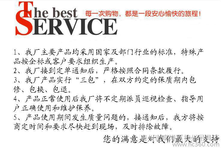 我厂建立了强有力的质量保证体系和生产过程的质量控制系统,严格执行国家设计、生产标准,有严格的生产工艺过程和标准,有先进严格的检验、检测标准和手段,保证出厂产品合格率 100% 。 信守承诺、注重信誉、建立了诚信可靠、快捷、迅速、便利、周到的售后服务网络。除产品售后保修一年外;还长期提拱零配件和终身维修。设有专门的售后服务队,还可以根据客户的需要提拱“一条龙”服务。