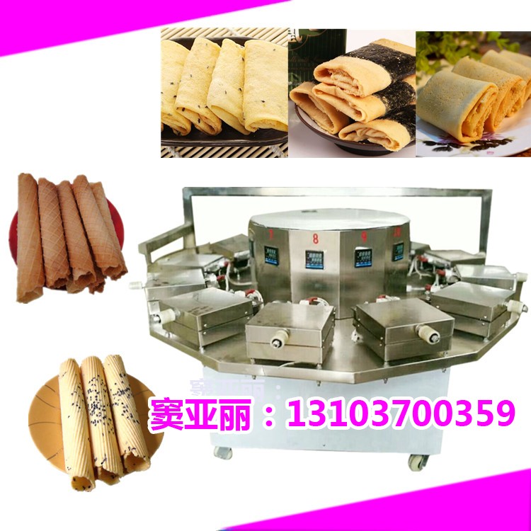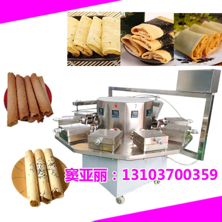 该蛋卷机特点:自动化程度高,自动注料,自动压盖,自动起模。