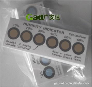 大部分的电子元器件、精密光学部件等高端电子、仪器设备容易受到湿气的影响导致产品锈蚀、灵敏度降低甚至导致不可恢复的损坏。为避免产品受到湿气的侵蚀及损坏,大部分产品会采用防潮包装组合,在最后成品及半成品的包装阶段对产品进行保护,而湿度指示卡就是便捷、经济的检测湿度是否在受控范围的物料,当打开密封袋,湿度卡上的颜色显示读出的数据就可以作为监察密封包装内的湿度是否在规定的湿度范围之内的依据,同时,也能间接反映出密封包装内的干燥剂是否发挥吸潮效果。 湿度指示卡(Humidity Indicator Cards)又称湿度卡、防潮标签、防潮卡.是用来显示密封空间湿度状况的卡片,是检测在密闭包装内的相对湿度是否安全的一种环境测量产品。圆圈上方或侧方的百分率数据是对应圆圈指示的相对湿度数据. 有钴湿度卡(蓝色变粉红) 如果包装中的湿度到了或者超过该湿度值的话,卡片上的点就会从蓝色变成粉红色,立即可知包装容器的密封状况或干燥剂是失效,或湿度已达或超过不能保存物品的程度。 湿度卡是可逆变化的,湿度超过对应的湿度值,颜色从蓝色变到红色,如果湿度低于对应的湿度值,已经变粉红色的湿度卡可以变回蓝色,只是从粉红变化回蓝色需要更长的时间,更需要足够的的干燥剂来使湿度卡恢复蓝色状态。 1湿度卡:以直观的从颜色变化来判断湿度状况。其原理就是根据氯化钴吸水后产生物质的颜色变色的原理,[Co(H20)4Cl2]为蓝色[Co(H2O)6]2+为红色 干燥时湿度卡是蓝色的,如果圆圈内的颜色从蓝色变化到粉红色,表示包装内的湿度达到或超过了圆圈对应的相对湿度数值。 湿度卡是可逆变化的,湿度超过对应的湿度值,颜色从蓝色变到红色,如果湿度低于对应的湿度值,已经变粉红色的湿度卡可以变回蓝色,只是从粉红变化回蓝色需要更长的时间,更需要足够的的干燥剂来使湿度卡恢复蓝色状态。 2湿度指示卡是一种便捷而廉价的检测环境湿度的安全方法,使用者可以通过卡片上的颜色迅速判断产品包装内的湿度及干燥剂的效果。如果包装中的湿度超过或等于该湿度值,卡片上的对应的点就会从干燥色变成吸湿色,据此可以简易地得知干燥剂的使用效果。 2004年欧盟环保法规(2004/73/EC)已将氯化钴列为二类致癌物质,现在对含钴类湿度指示卡禁止使用物质,所有出口到欧盟国家的产品必须符合该法规要求。因此现在大量使用的湿度指示卡其主要成分就是氯化钴,将很快被禁止使用。如SONY公司在SS-00259)8版上禁止使用含氯化钴的湿度指示卡及其他产品。 为适应相关法规及环保发展要求,珠海广安达GAD公司专门设立了湿度卡事业部,与现已研发新一代环保湿度指示卡(Ⅰ型、Ⅱ型、Ⅲ型)。并对指示卡的生产工艺进行较大水平的升级,日产量超过800000张,该系列产品符合欧盟RoHS指令(不含),已通过CTI,SGS检测,指示颜色变化明显,做工精良,使用方便。