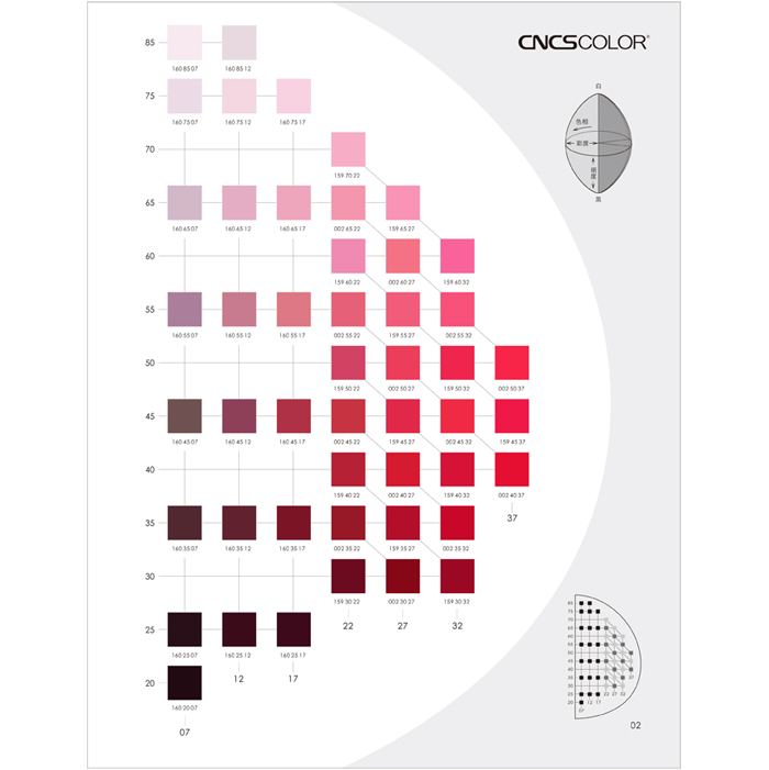 ● 按照无彩色和有彩色划分和编排**页为无彩色和弱色相区间,其他页将CNCSCOLOR色彩体系160级色相等分为20个区间,每页包含一个色相区间的色彩,垂直直线相连或斜线相连的色彩具有相同的色相。