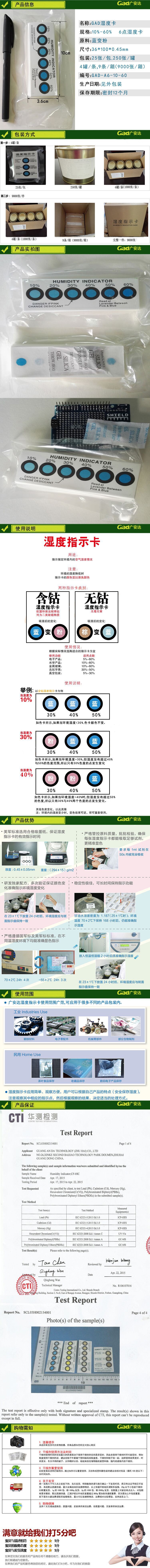 湿度指示卡是一种便捷而廉价的检测环境湿度的安全方法,使用者可以通过卡片上的颜色迅速判断产品包装内的湿度及干燥剂的效果。如果包装中的湿度超过或等于该湿度值,卡片上的对应的点**会从干燥色变成吸湿色,据此可以简易地得知干燥剂的使用效果。