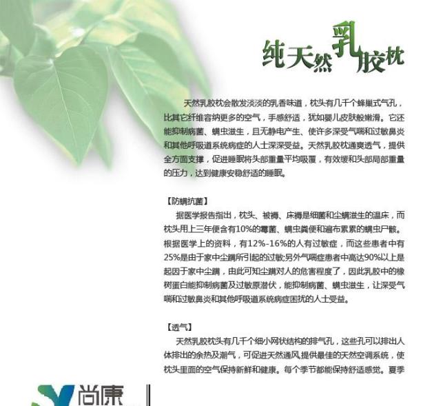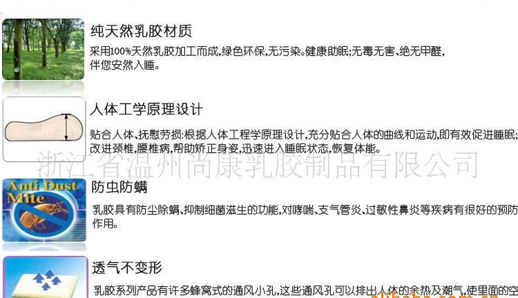 温州尚康乳胶制品有限公司是乳胶枕、天然乳胶、乳胶床垫等产品专业生产加工的有限责任公司,我公司拥有八年乳胶生产经验和一整套完整、科学的质量管理体系。我公司的诚信、实力和产品质量获得业界的认可。欢迎各界朋友莅临我公司参观、指导和业务洽谈。