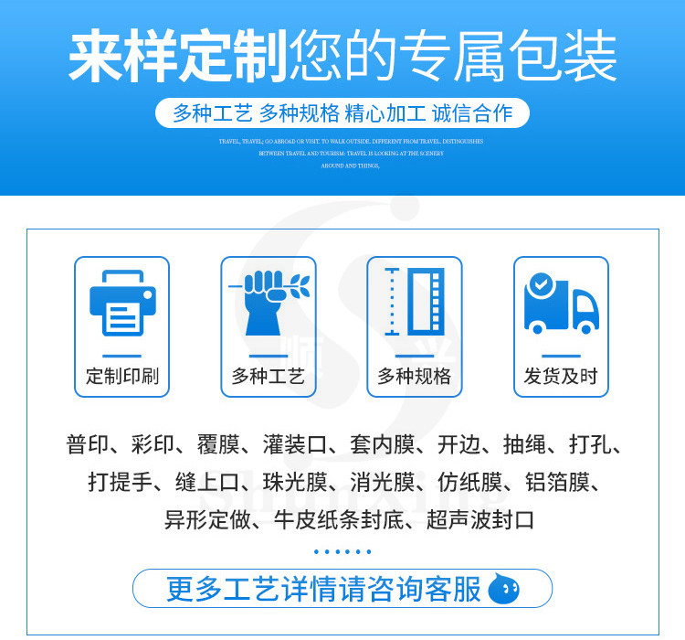 | 用途 | 床上用品袋,物流包装,通用包装,饲料包装,数码包装,收纳袋,饰品袋,食品袋,日用品包装袋,建材包装,化工包装,化肥包装,服装袋,服饰包装,防水袋 |