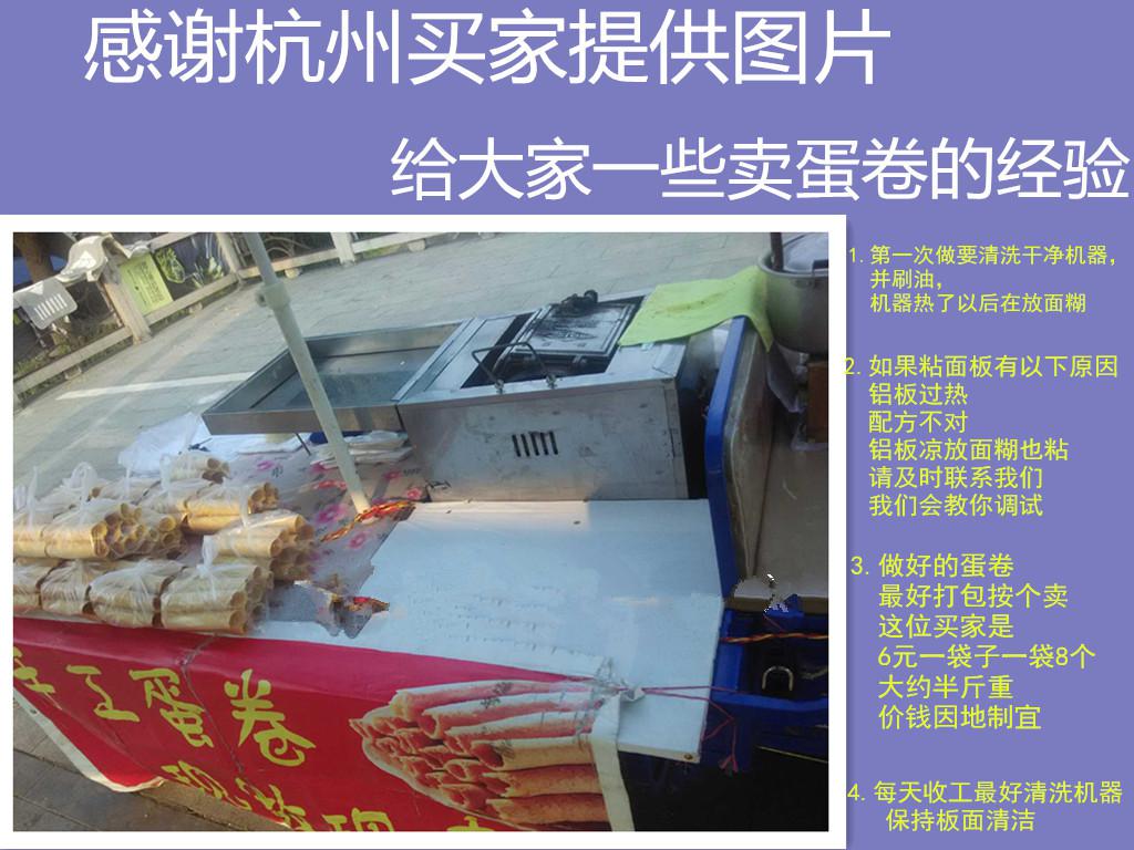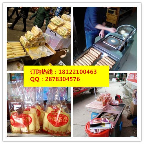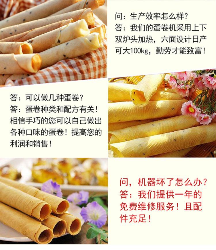 面粉、鸡蛋,食盐,白糖,芝麻, 香葱,花生等,用它可生产出香酥蛋卷,芝麻蛋卷,花生蛋卷,葱油蛋卷,桔香蛋卷,夹心蛋卷,香辣蛋卷,椒盐蛋卷等系列风味,每台机每小时产量为3-5公斤,以每天生产8小时计算,按市价,成品成本推算每市斤可获利2.5元。每台每天可获纯利100元以上。
