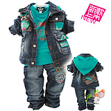 新款5折中童春秋装 男童秋装连帽T翻领长袖牛仔服三件套 Yk9086