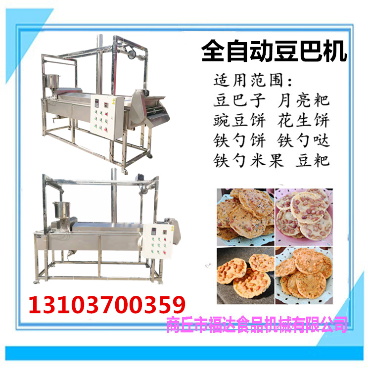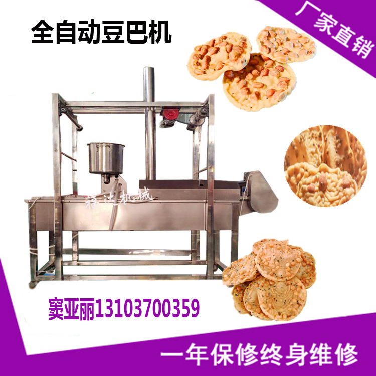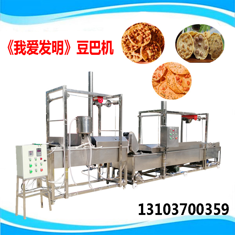 豆巴机自动注浆:可以调节大小计量,定做出大小不同、厚度不同的产品;自动撒豆,可撒黄豆 花生米 瓜子 芝麻等,撒豆的数量也可以调节,不会出现数量明显不一样的情况。设备速度也可以调节。自动成型后,自动进入油炸锅油炸,自动控温,且油炸时间可调。