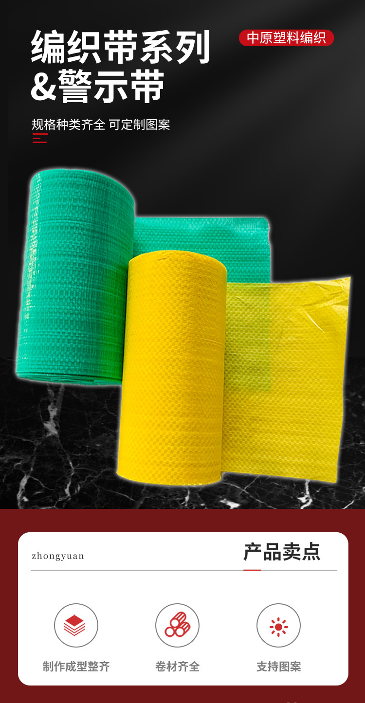 编织包装带是本公司为了满足市场需求,开发生产由PP编织布,或者牛皮纸复合编织布分切而成。 通常分切工艺分为冷切和热切两种。冷切是采用刀片分切,边缘平整无毛边。编织布淋膜后方可加工;热切是采用电热设备分切,边缘稍有毛边。分卷类型又分机器自动包装和手工包装,是目前主要工业包装材料之一,被广泛应用在各种电线电缆,线材,管材,轮胎,钢圈,机械设备、零部件,警示带等产品的外包装。