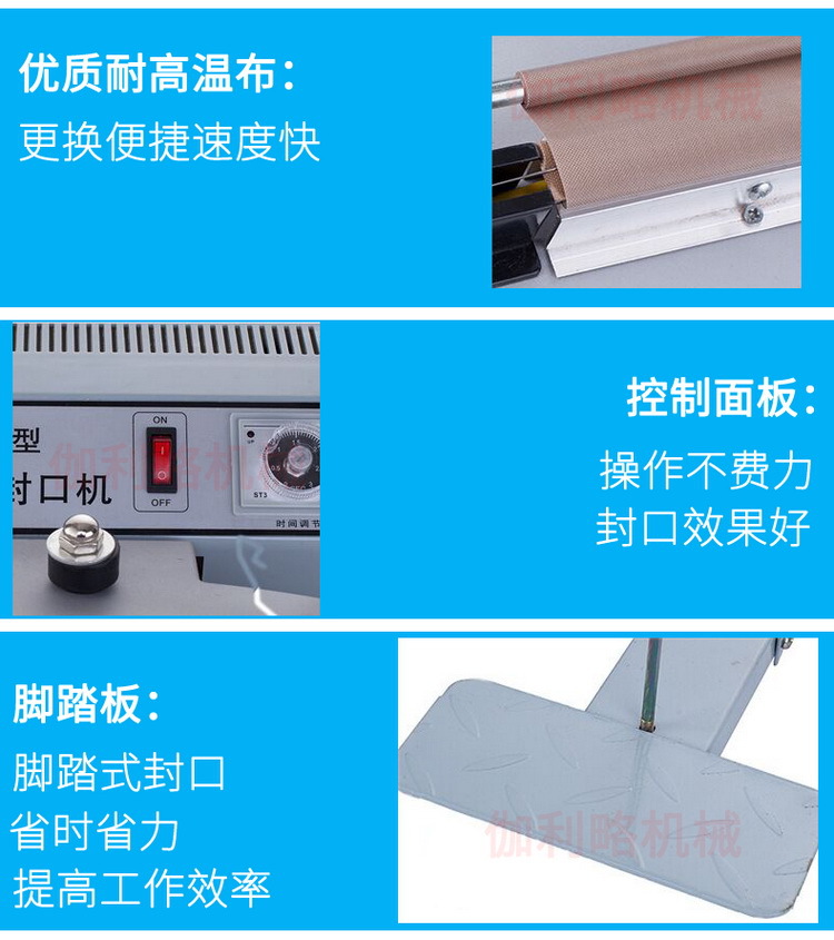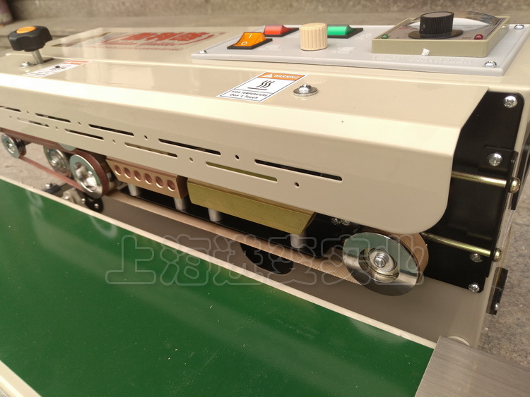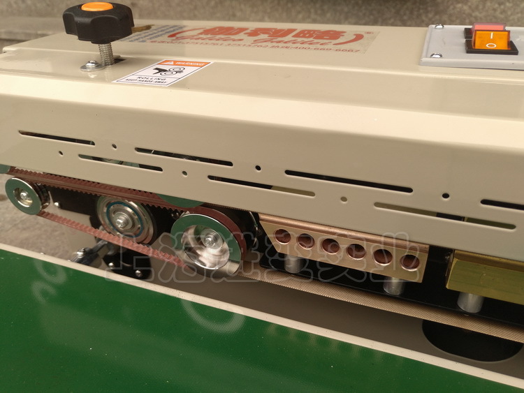 3、该款封口机是将塑料包装袋连续不断地由传送→送进→封口→冷却→滚花或印字。具有连续封口效率高、封口质量好、结构合理、操作方便等特点。可与各种包装流水线配合使用,其封口长度不受限制,并适应于各种不同材料的塑料薄膜袋。