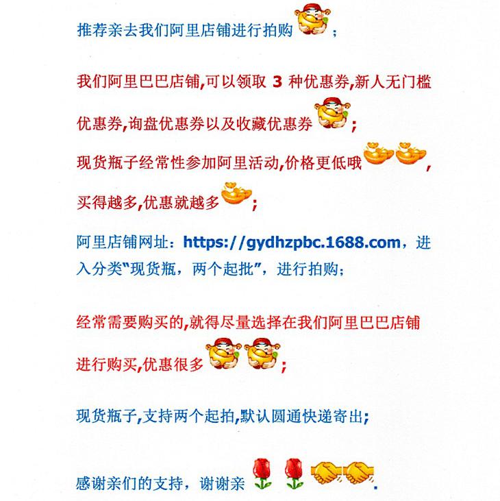 由于玻璃瓶特殊,易碎,尽管层层包装,一次又一次的加强,还是不能保证运输途中少量破损问题;不过在包装过程中我们一定会尽量打包结实,把破损率降低; 我们公司有固定的物流运输公司,需要发货的客户,请尽量用我们固定的物流运输公司发货,已经合作十年以上的物流了,这样会大大降低瓶子的破损率; 如有造成少量破损,尽请谅解,但是如果情况严重,我们一定会为您及时处理,请放心购买,希望相互合作愉快,谢谢大家的支持!
