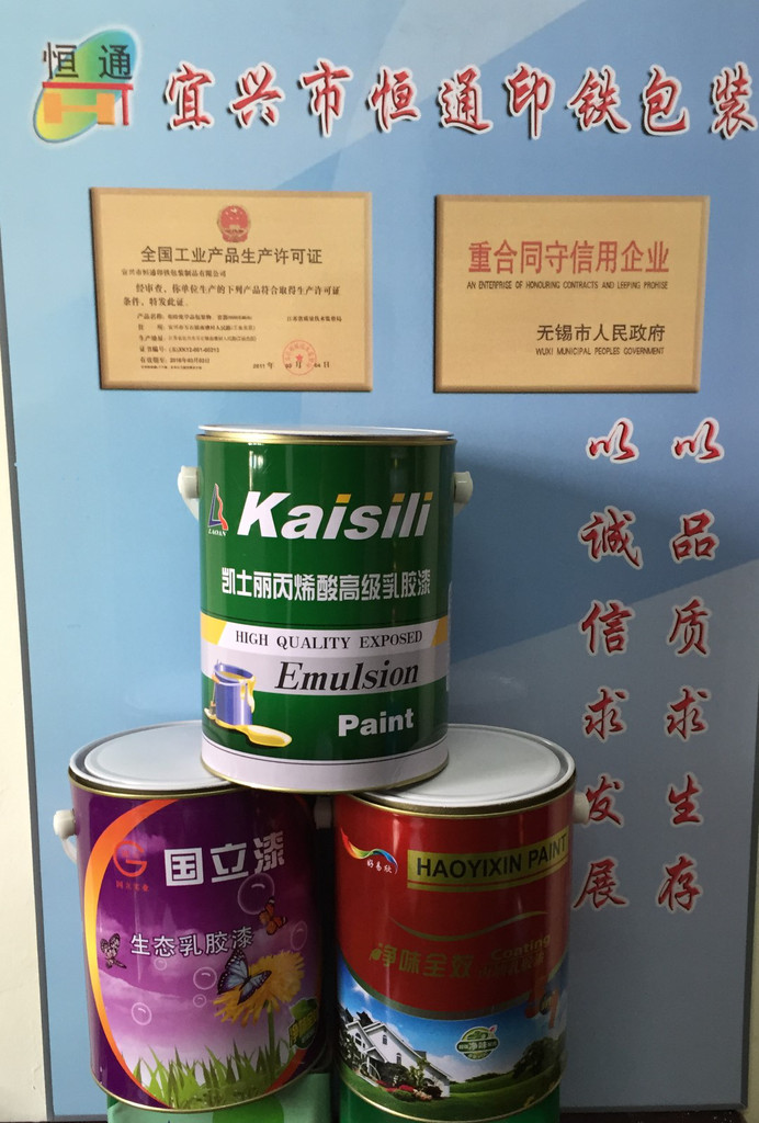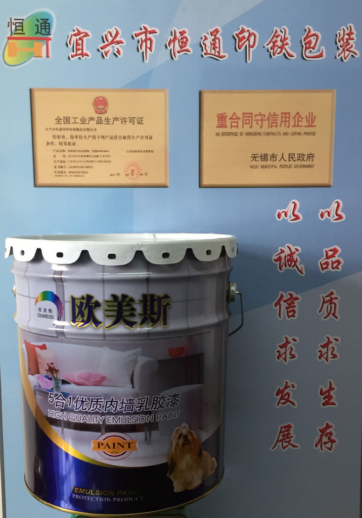 二、 改革工艺提高品质:为解决水性涂料桶生锈的难题,公司配套马口铁复膜生产线,桶的内壁(包括桶底、桶盖)全部采用耐腐蚀的复膜工艺,缝焊处采用白色聚脂喷涂工艺,确保桶的内壁、焊缝不生锈。