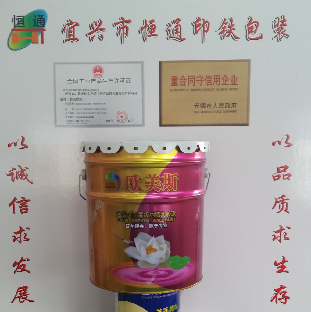 二、改革工艺提高品质:为解决水性涂料桶生锈的难题,公司配套马口铁复膜生产线,桶的内壁(包括桶底、桶盖)全部采用耐腐蚀的复膜工艺,缝焊处采用白色聚脂喷涂工艺,确保桶的内壁、焊缝不生锈。