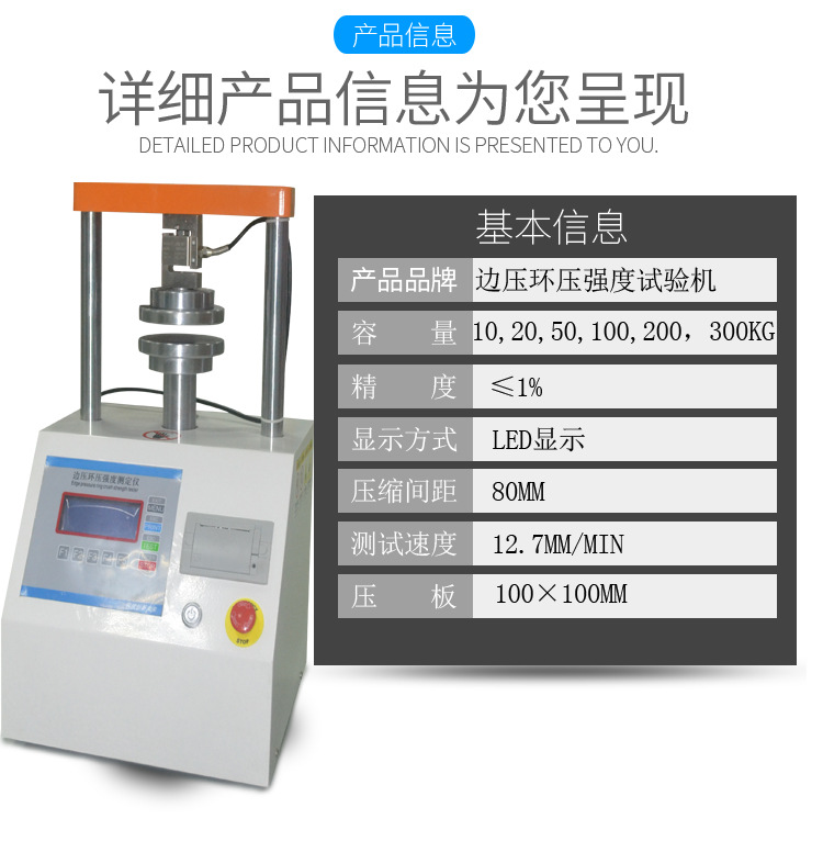 3.可输入相关数据并自动换算环压强度,边压强度,自带包装堆码测试功能;可直接设定力量、时间,测试完成后自动停机。