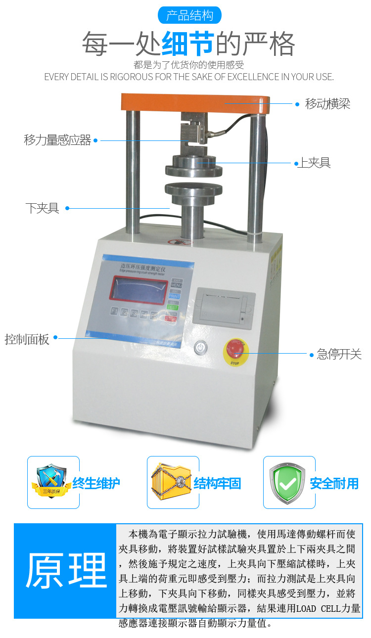 纸箱边压强度测试机针对瓦楞纸板纸箱等包装材料方面, 进行多种纸张品质测试,即环压(RCT)、平压(FCT)、边压(ECT)、粘合(PAT)及一般抗压(CMT)等5种测试, 是结合多项功能于一身之测试设备。 因为运送上的需要,纸箱会被堆积起来,因此重量负荷的忍受度则取决于纸板的性能。本机台配备各种夹具附件可测试原纸之环压强度、纸板之平/边压强度、胶合强度,以便纸品生产企业控制生产成本和提高产品质量