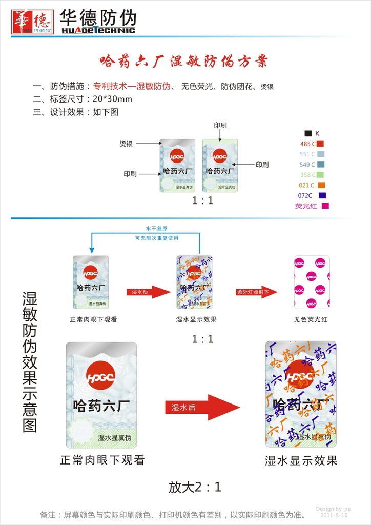 哈药六厂防伪标签方案采用我公司**湿敏防伪技术,此技术拥有以下特性: